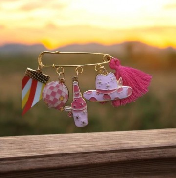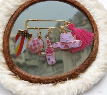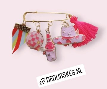 Speld met Oeteldonkslint, discobal, champagne fles, westernhoed en roze flosje. De bedels hebben een leuke gouden flonkeling. Leuk voor het uitgaans durske / jungske!