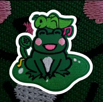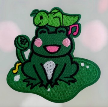 Embleem van een kikker op kroos en muzieknoot.