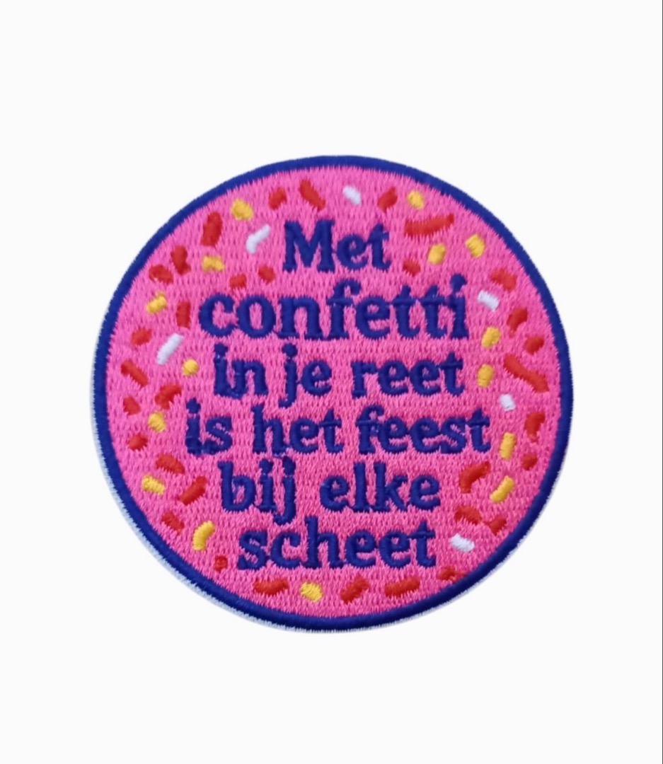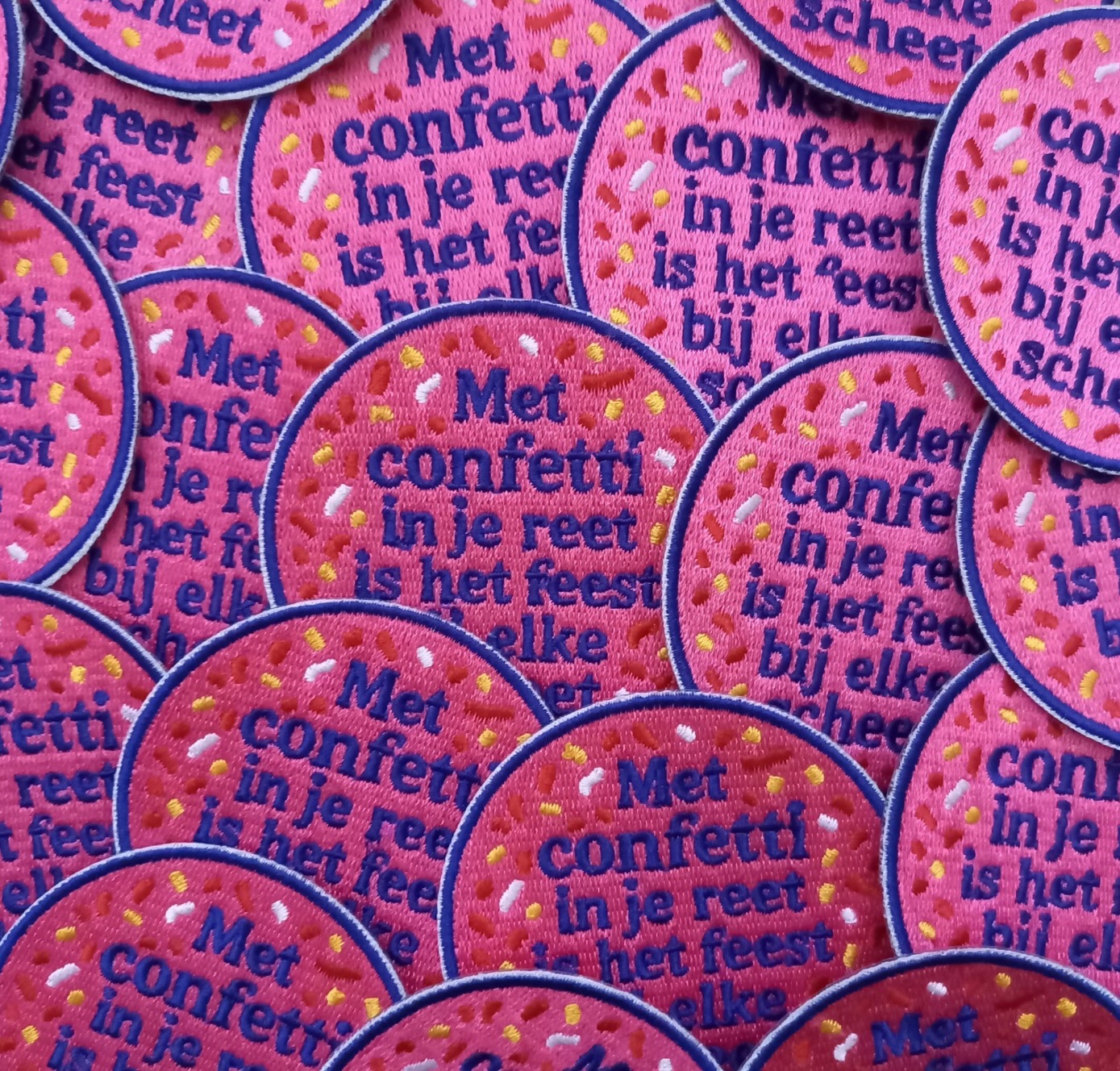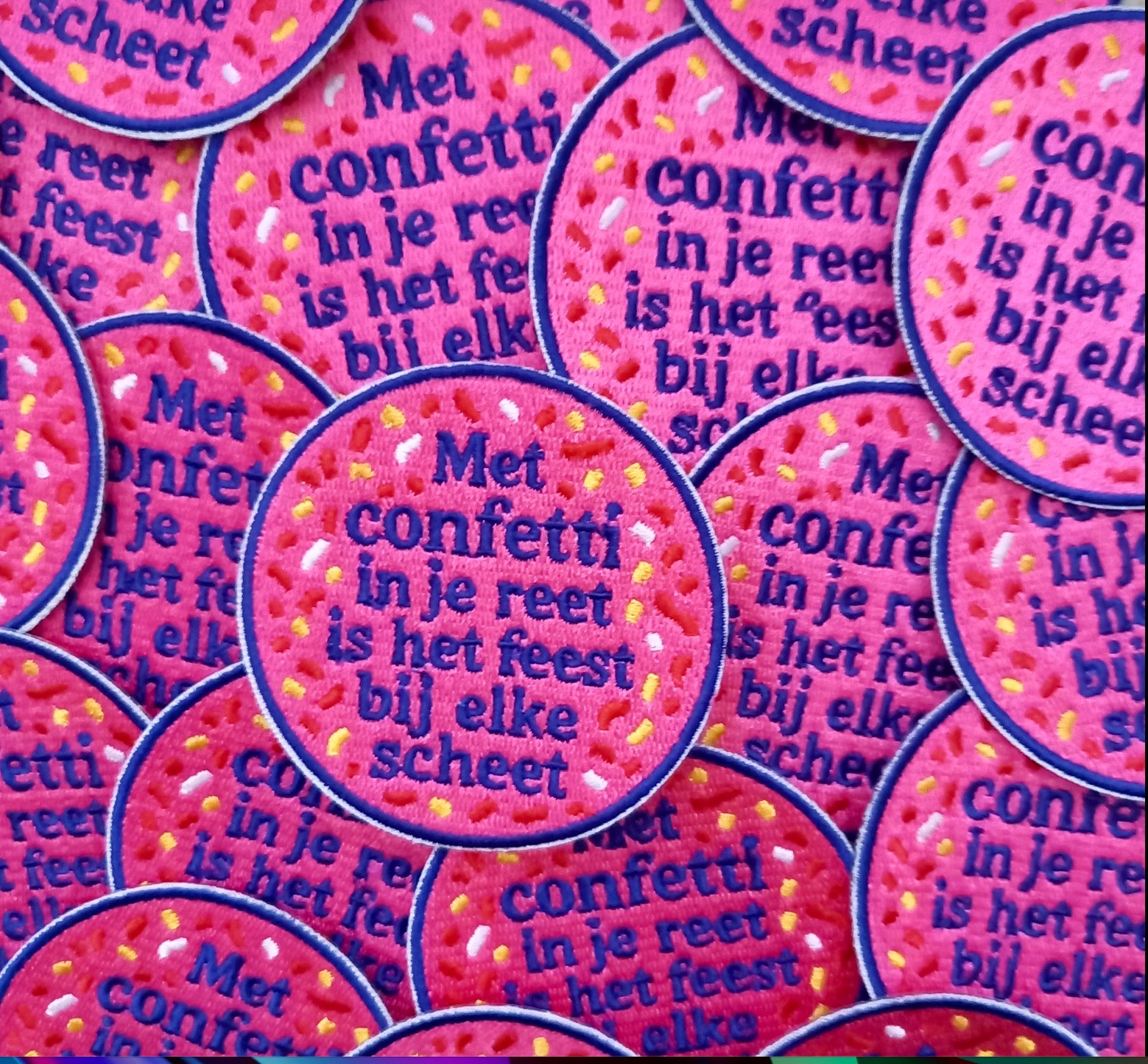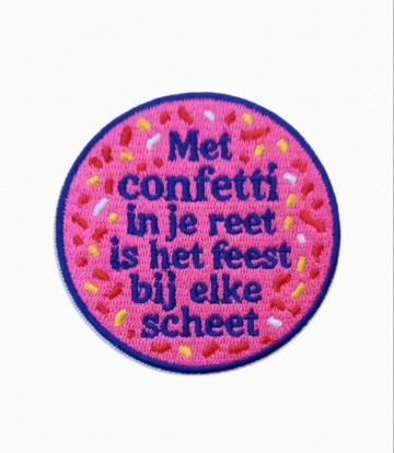 Grappig Tekst Embleem. Roze Oeteldonks Embeem met tekst:  Met confetti in je reet is het feest bij elke scheet.