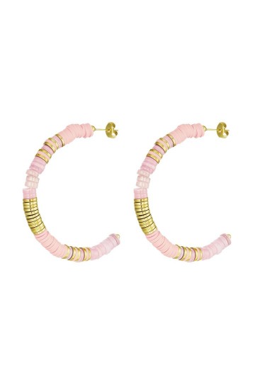 Prachtige zomerse oorringen in de kleur roze! De oorbellen zijn gemaakt van polymeerklei, hematiet, zeeschelp en stainless steel. De oorbellen hebben een afmeting van 5 cm.